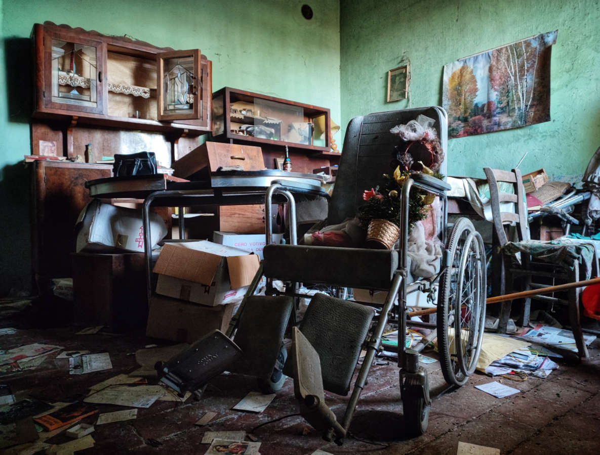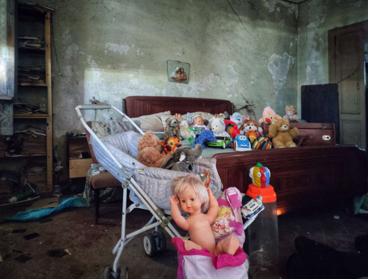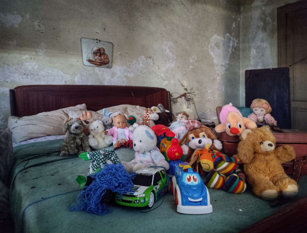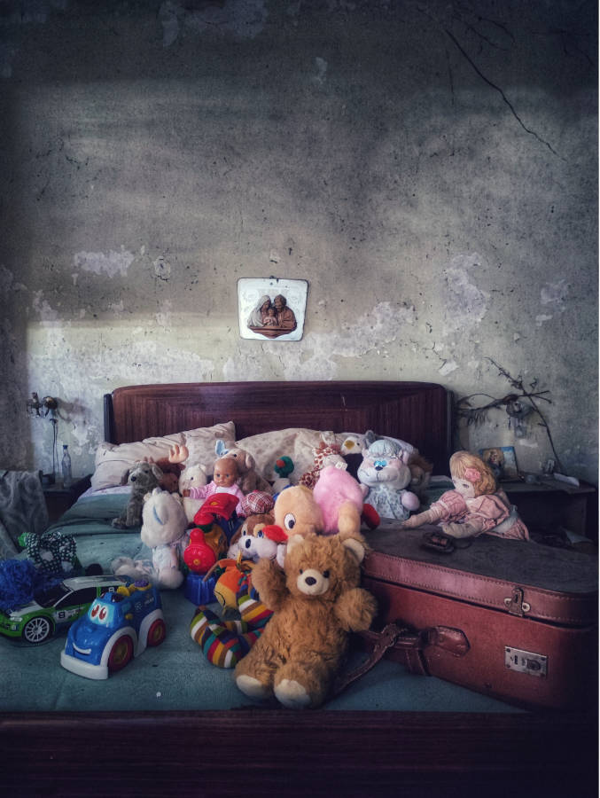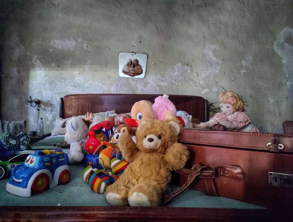 Salendo le scale, notai un piccolo topolino, sicuramente aveva conosciuto tempi migliori, sembrava quasi una macchia scura sul rosso acceso, se pur consunto del pavimento. La sua presenza, pur così insignificante, portava un senso di tristezza in un luogo così desolato. Quando raggiungemmo il piano superiore, ci trovammo davanti a un paradiso dimenticato dai bambini: migliaia di giochi, migliaia di peluches, giacevano inermi sul pavimento, sparsi un po' dovunque. Erano le testimonianze di un'infanzia felice, ma ora apparivano tristi e abbandonati, alcuni erano posizionati sul letto, i loro occhi spalancati ci spiavano con una dolcezza inquietante.