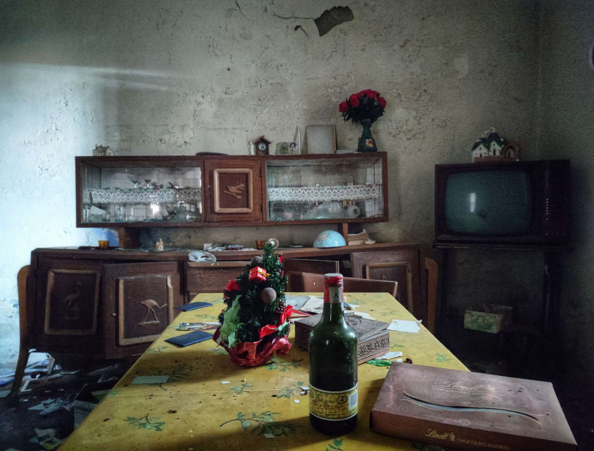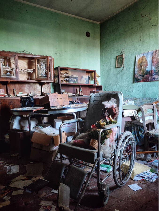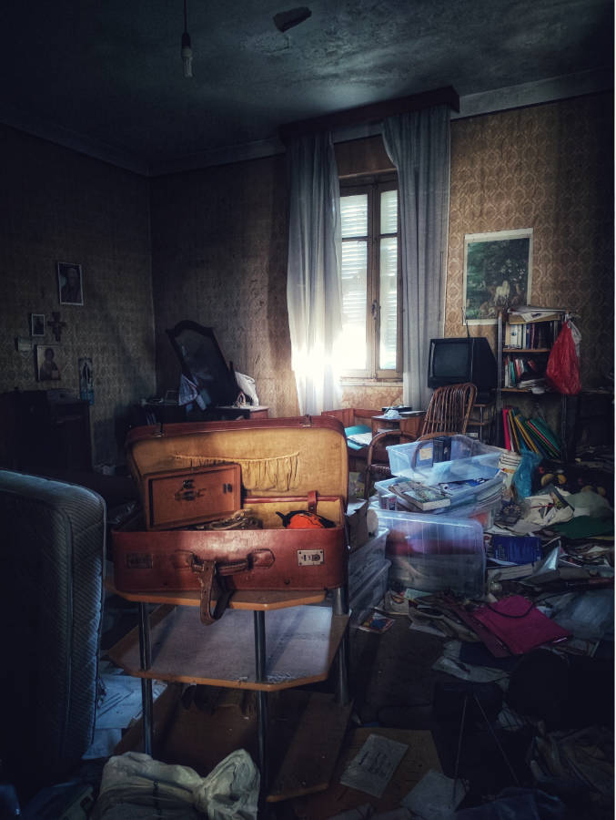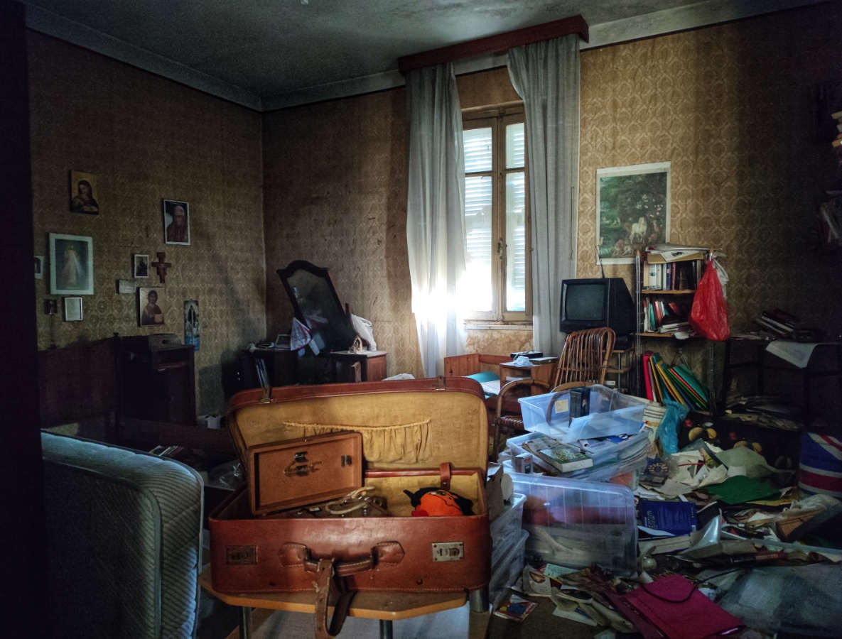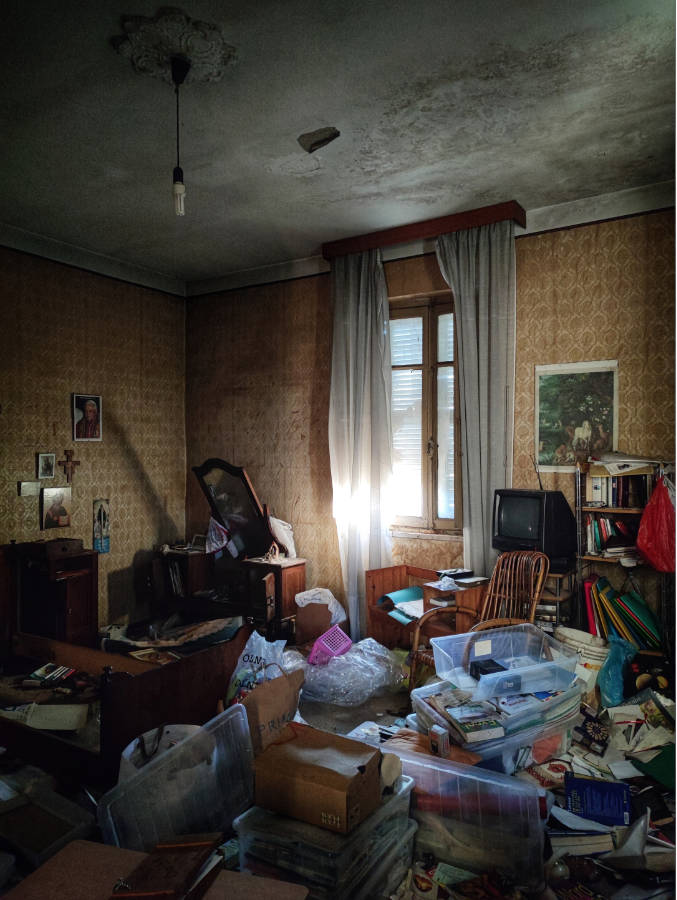 Il salotto, con le ante chiuse che lasciavano filtrare una luce inadeguata, raccontava un altro capitolo di questa esistenza segnata dal dolore. Le immagini sacre appese al muro, diverse da quelle della sala, osservavano tutto con uno sguardo di pietà. Erano custodi di un dramma che si svolgeva in silenzio. Chi viveva qui? Quali risate avevano riempito questi spazi? E ora, dove erano finiti?