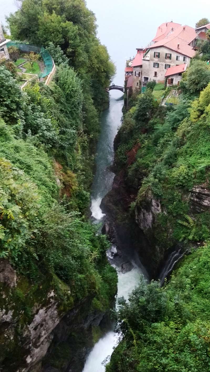 Ascoltiamo curiosi e nel frattempo ci avviciniamo, il rumore dell’acqua che scende supera il rumore dell’acqua che batte sulle nostre teste, restiamo a bocca aperta da quanto lo spettacolo naturale sia impetuoso ed affascinante, il signore ci dice, che per ammirarlo da più vicini c'è una gradinata da percorrere oltre 270 gradini, nonostante il diluvio decidiamo lo stesso di andare a vedere, ormai eravamo lì, scendiamo cautamente le scale, (Lyon con noi dentro la borsa da passeggio, con la copertina che se la dormiva) e dopo molte, molte scale arriviamo, ci fermiamo su questo ponte, l’edera circonda le case… siamo soli e davanti a noi questa cascata che ci bagna il viso. Che meravigli! La natura ci regala delle cose meravigliose, noi dobbiamo solo aprire gli occhi e riempirli di questi luoghi.