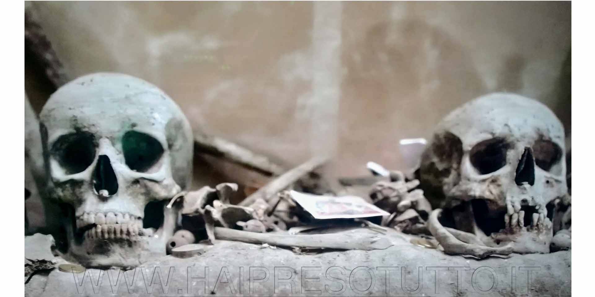 Nell’ipogeo della chiesa si trovano bigliettini messaggi e oggetti ad ornamento dei teschi che sembrano immortali,