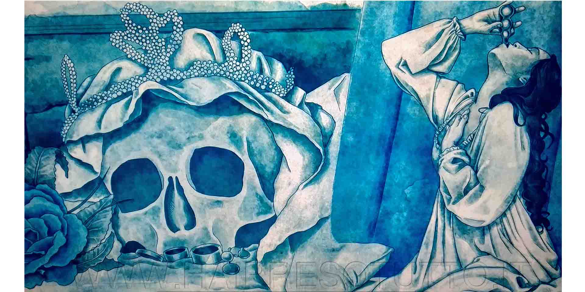 Il teschio coperto da un velo da sposa, ornato di una preziosa corona, è collocato di fianco ad una coppia di teschi che, nell’immaginario popolare, rappresentano i suoi servitori, una principessa morta suicida giovanissima subito dopo le nozze.